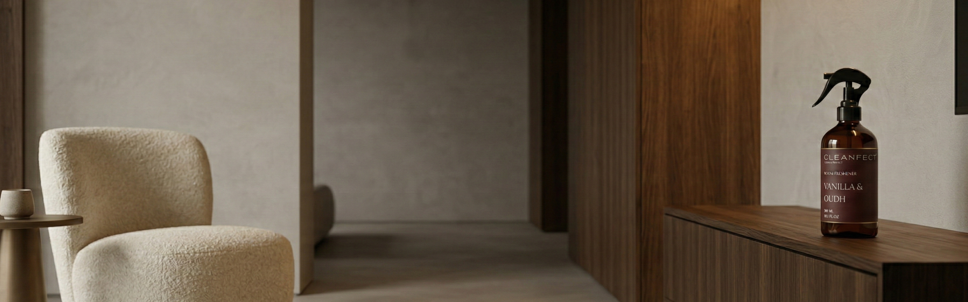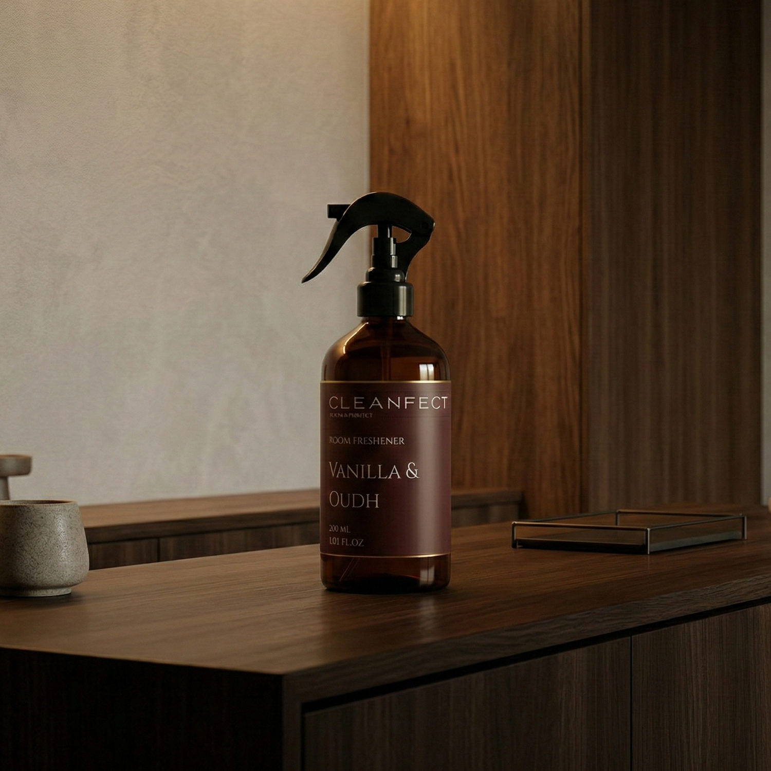 Cleanfect Vanilla & Oudh Air Freshener delivers long-lasting luxury fragrance with deep woody notes. Designed for modern homes seeking non-toxic air care.